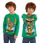 Charge! These bold, bright dino tee shirts have a way of making spirits "saur." Roar, even, for when kids cross their arms in front they'll see a big change in their dino's chompers. Made of comfy, pre-shrunk 100% cotton, and feature brilliant brushwork, beautiful screenprinting, and glow-in-the-dark chompers. For best results, wash in cold water. Do not use bleach; dry on low heat.