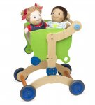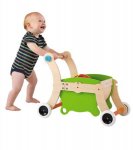 With not one, not two, but three or more different ways to use this innovative apparatus as your child grows, it's certain to bring years of enjoyment. Babies ages 9 to 24 months use it as a walker (with wagon!) when they take their first steps; it also easily converts to a fun scoot-along ride so that toddlers 12 to 36 months can tote toys along with them; and kids 3 and up can employ it as a pretend-play shopping cart, doll buggy and toy trolley. It's sturdily made from solid wood with smooth-rolling plastic wheels.